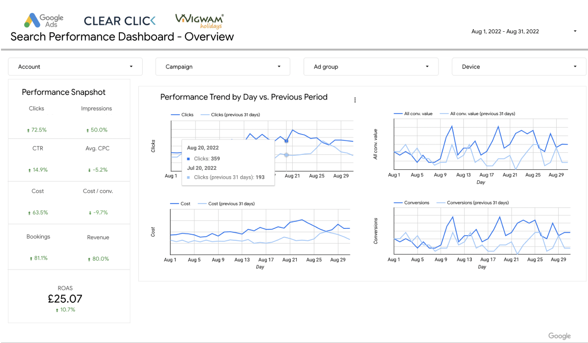 With a franchise business model and large in-house team, Wigwam® needed a reporting methodology that allowed stakeholders to access detailed performance metrics. Clear Click recognised that data-driven decision making was key to achieving business growth, and worked with Wigwam® to develop a built-for-purpose reporting framework. By presenting actionable insights to key stakeholders, Clear Click helped Wigwam® make informed decisions that positively impacted the business and highlighted areas of strength.